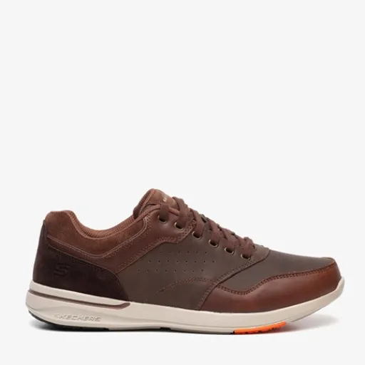 Bruine Skechers Elent Velago heren sneakers. Gemaakt van leer, een binnenwerk van leer en textiel en een stevige buitenzool van rubber. De sneakers hebben een vetersluiting en niet-uitneembare binnenzool van textiel. Deze bevat Air-Cooled memory foam voor optimaal comfort en koele voeten. De sneakers van Skechers hebben een suede inzet op de hak en perforaties op de zijpanden en neus. De rubberen loopzool biedt grip en extra demping.