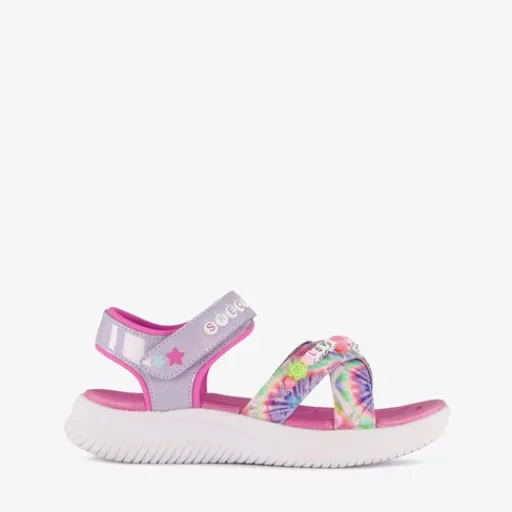 Lila Skechers Jumpsters sandalen voor meisjes. Gemaakt van textiel, een binnenwerk van textiel en een rubberen zool. De sandalen hebben een wreefbandje met klittenband en cross-over banden over de tenen. Het voetbed is comfortabel en gemaakt van synthetisch materiaal. Voorzien van tie dye print en kraaltjes op de teenband en een flexibele zool.