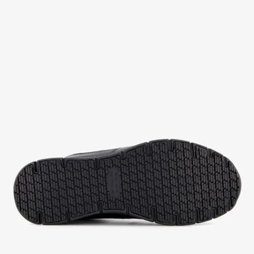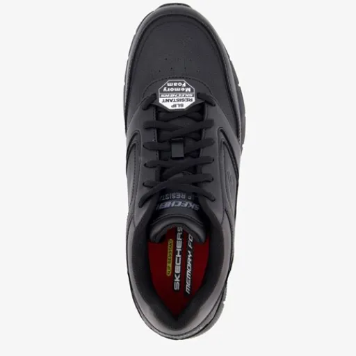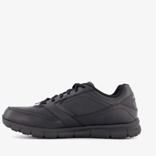 Zwarte Skechers Nampa werkschoenen voor heren. De sneakers hebben een stevige antislip zolen waardoor je niet zomaar uitglijdt. Ideaal dus als je in de horeca, zorg of schoonmaak werkt! Het buitenwerk is gemaakt van imitatieleer, het binnenwerk van textiel en de buitenzool van rubber. De schoenen zijn voorzien een vetersluiting voor een goede pasvorm. Het vaste voetbed bevat Memory Foam wat demping en comfort biedt.