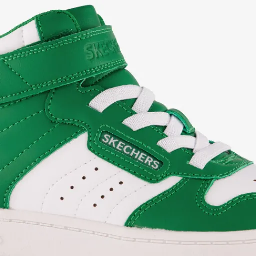 Groen-witte Skechers Quick Street sneakers voor jongens. Het buitenwerk heeft perforatiegaten voor ventilatie en is gemaakt van imitatieleer, het binnenwerk is van textiel en de stevige zool met profiel van rubber. Deze hoge sneakers hebben elastische veters met klittenbandsluiting voor een optimale pasvorm en hiellusjes voor een makkelijke instap. Het comfortabele voetbed van textiel is niet uitneembaar.