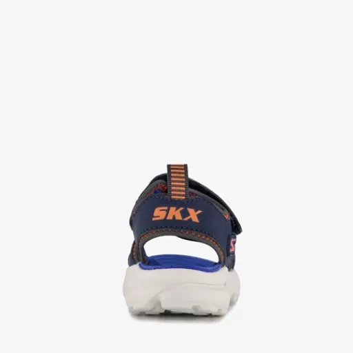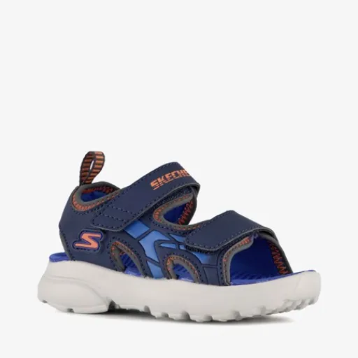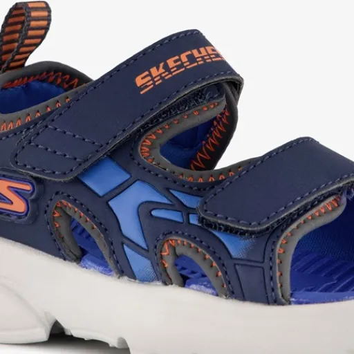 Blauw met oranje Skechers Razor Splash – Aqua Buddies sandalen voor jongens. Deze verstelbare en sportieve outdoorsandaal heeft een synthetisch bovenwerk met reliĆ«f, verstelbare klittenbandsluitingen bij de instap en voorvoet en een comfortabele, gewatteerde binnenzool die demping biedt. De sandalen van Skechers mogen in de wasmachine en hebben een superflexibele, lichtgewicht profielzool. Door de aanpasbare sluiting kun je ze gemakkelijk aan en uit te trekken en biede ze een goede pasvorm.