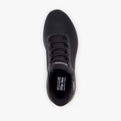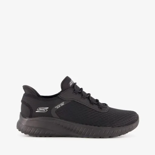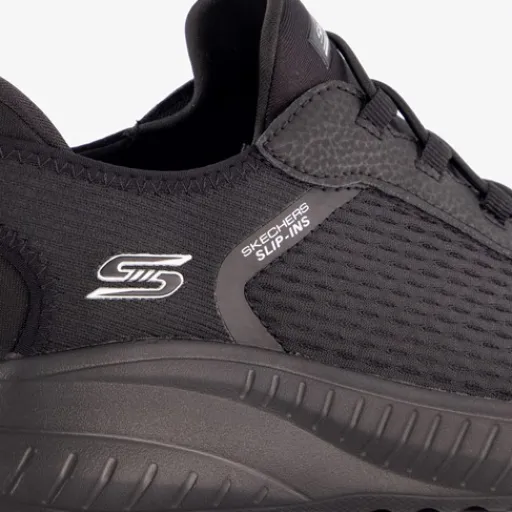 Zwarte Skechers Hands Free Slip-ins®: Bobs Sport™ Squad Chaos sneakers voor dames. Gemaakt van textiel, een binnenwerk van textiel en een rubberen zool. Voorzien van elastische veters voor gemak tijdens het aan- en uittrekken en een comfortabel voetbed met memory foam. De sneakers beschikken over een exclusieve Heel Pillow™ en een dempende Skechers Memory Foam™-binnenzool.¶