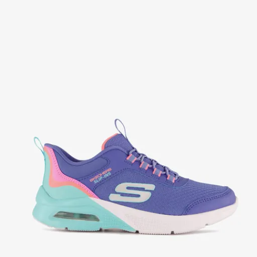 Paarse Skechers Slip-ins: Microspec Max Color Trifecta meisjes sneakers. Gemaakt van imitatieleer en mesh, een binnenwerk van textiel en een rubberen zool. Dankzij de elastische, Hands Free Slip-ins® veters stap je gemakkelijk in de schoenen, terwijl de Exclusieve Heel Pillow™ je voeten op zijn plaats houdt. De sneakers hebben een comfortabele binnenzool met Skechers Air-Cooled Memory Foam™ demping en een en een Skech-Air®-tussenzool met zichtbare airunit.