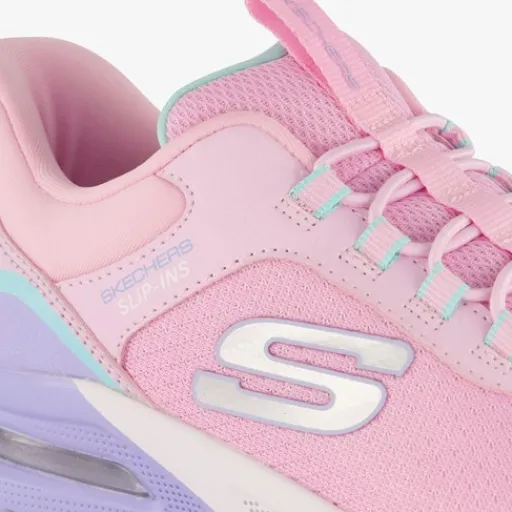 Roze Skechers Slip-ins: Microspec Max meisjes sneakers. Gemaakt van imitatieleer en mesh, een binnenwerk van textiel en een rubberen zool. Dankzij de elastische, Hands Free Slip-ins® veters stap je gemakkelijk in de schoenen, terwijl de Exclusieve Heel Pillow™ je voeten op zijn plaats houdt. De sneakers hebben een comfortabele binnenzool met Skechers Air-Cooled Memory Foam™ demping en een en een Skech-Air®-tussenzool met zichtbare airunit.