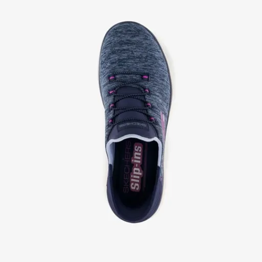 Stap handsfree in en uit met deze Blauwe Skechers Slip-Ins Summits Dazzle Navy sneakers voor dames. Gemaakt van textiel, een binnenwerk van textiel en een flexibele loopzool van rubber. De sneakers hebben elastische veters en een comfortabel voetbed met memory foam. Deze is uitneembaar.