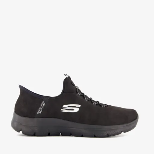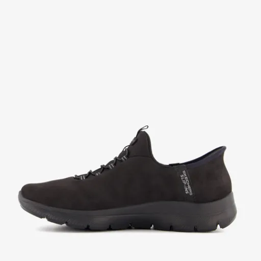 Zwarte Skechers Slip-ins: Summits Unknown Trail sneakers voor dames. Gemaakt van vegan imitatieleer met een binnenwerk van textiel en een rubberen profielzool. De instappers beschikken over de Skechers Hands Free Slip-ins® elastische veters voor een gemakkelijke pasvorm en instap. Dankzij de Heel Pillow™ blijven je voeten goed op zijn plaats. Voorzien van een dempende Skechers Air-Cooled Memory Foam®-comfort binnenzool. De instappers kunnen in de wasmachine. Binnenzool is uitneembaar.