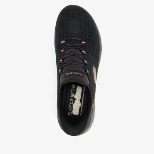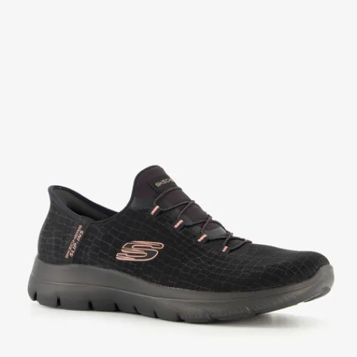Zwarte Skechers Slip-Ins: Summmits Classy Night Black Gold sneakers voor dames. Gemaakt van textiel met een binnenwerk van textiel en een rubberen profielzool. Voorzien van de Skechers Hands Free Slip-ins® technologie voor een comfortabele pasvorm en makkelijke instap. De Exclusieve Heel Pillow™ houdt je voet stevig op zijn plaats. De sneakers hebben een comfortabele binnenzool met Skechers Air-Cooled Memory Foam®-demping en een lichtgewicht, flexibele schokabsorberende tussenzool. Op het bovenwerk is subtiel glinsterende slangenprint aangebracht.