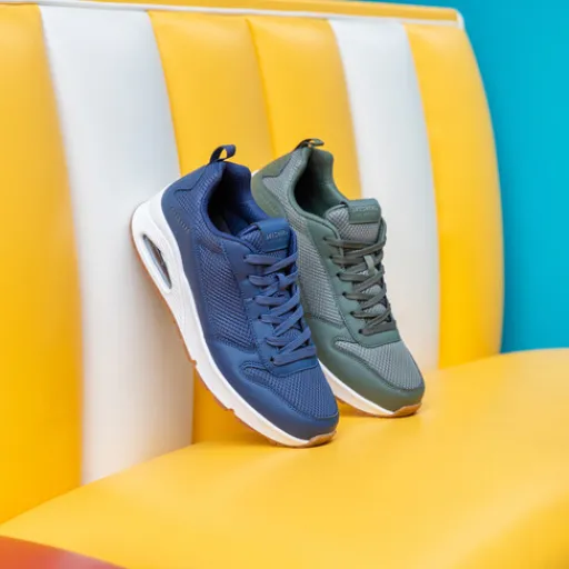 Groene Skechers Uno – Fastime sneakers voor heren. Gemaakt van imitatieleer en mesh, een binnenwerk van zachte stof en een stevige profielzool. De sneakers hebben een vetersluiting en hiellusje voor een makkelijke instap. Het comfortabele Air-Cooled Memory Foam voetbed is gemaakt van textiel. Deze is niet uitneembaar. De sneakers hebben een gewatteerde enkelkraag. De voor- en zijpanelen zijn gemaakt van ademend mesh. De Skechers Uno hebben een met traagschuim gedepte, comfortabele binnenzool en een schokabsorberend hielkussen. De flexibele airzool zorgt voor grip en demping.