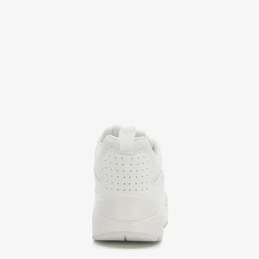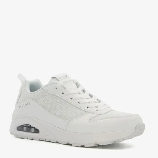 Witte Skechers Uno Fasttime sneakers voor heren. Het ademende bovenwerk is gemaakt van textiel en mesh, het binnenwerk van textiel en de flexibele zool van rubber. Voorzien van een vetersluiting voor een goede pasvorm en hiellusjes voor een makkelijk instap. Deze mooie heren sneakers hebben een Air Cooled Memory Foam binnenzolen die voor extra comfort zorgen. Deze zijn niet uitneembaar. De airzolen zorgen voor demping bij elke stap.