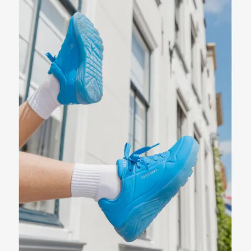 Blauwe Skechers Uno Ice sneakers voor jongens. Het buitenwerk is gemaakt van imitatieleer, het binnenwerk van textiel en de flexibele buitenzool met profiel van rubber. Voorzien van een vetersluiting en uitneembare binnenzool. Deze bevat Memory Foam die demping en comfort biedt. De sneakers hebben een opvallende, doorzichtige buitenzool en kleine perforatiegaten op het bovenwerk die voor ventilatie zorgen.