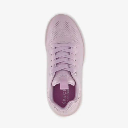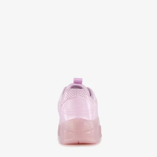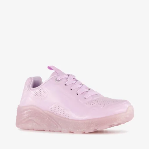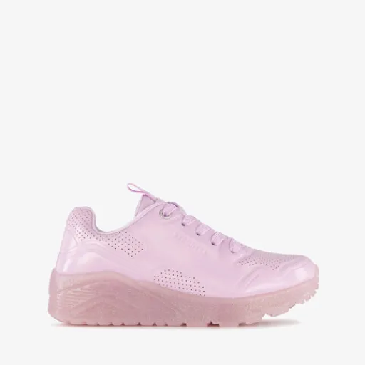 LRoze Skechers Uno Ice – Prism Luxe sneakers voor meisjes. Het buitenwerk is gemaakt van imitatieleer, het binnenwerk van textiel en de flexibele buitenzool met profiel van rubber. Voorzien van een vetersluiting en een comfortabele binnenzool van Memory Foam. De sneakers hebben een opvallende, doorzichtige buitenzool met glitters en kleine perforatiegaten op het bovenwerk die voor ventilatie zorgen.