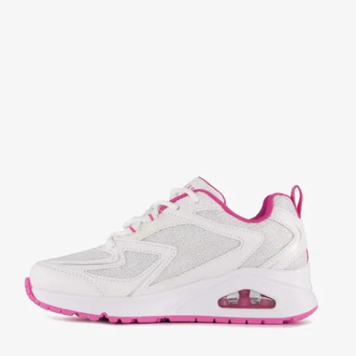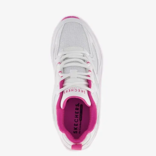 Wit met roze Skechers Uno sneakers voor meisjes. Het buitenwerk is gemaakt van imitatieleer, het binnenwerk van textiel en de stevige airzool met profiel is van rubber. Voorzien van een vetersluiting en hiellusjes voor een makkelijke instap. Het comfortabele voetbed bevat Memory Foam wat voor demping en comfort zorgt. Het bovenwerk van deze gave sneakers wordt zilverkleurige glitters. Binnenzool is niet uitneembaar.