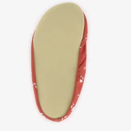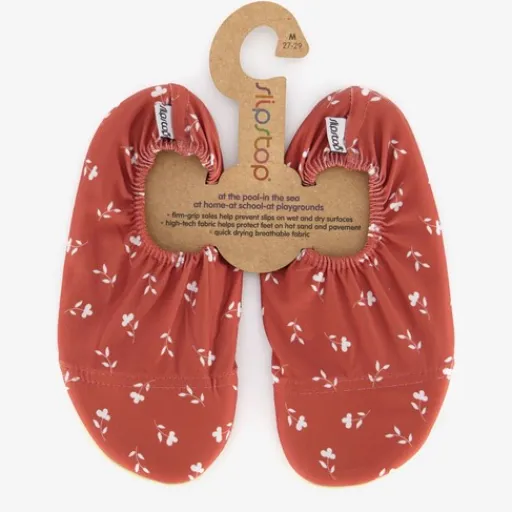 Rode slipstop kinder schoenen met opdrukken van witte bloemen. Het ademende buitenwerk van de schoenen is gemaakt van 87% polyester en 13% elastaan. De zool bestaat uit 84% PVC, 8% katoen en 8% elastaan. Slipstop schoenen houden de voeten van je kind schoon en droog. De schoentjes zijn licht, elastisch, flexibel, waterafstotend en hebben een profielzool. Ze kunnen zowel binnen als buiten gedragen worden. Dit maakt ze ideaal voor bij het zwembad en op het strand, maar ook heel handig om mee te geven naar de kinderopvang of mee te nemen naar de camping. Slipstop schoenen zijn daarnaast ook erg geschikt voor oudere kinderen en zelfs volwassenen. Ze kunnen gedragen worden tijdens het beoefenen van verschillende sporten en activiteiten.