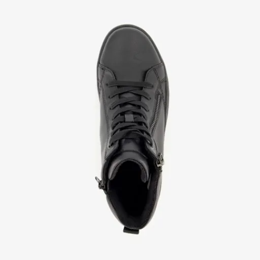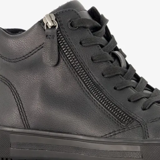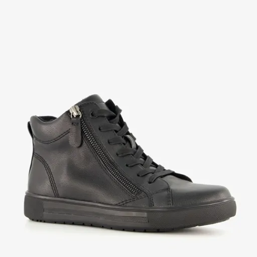 Hoge, zwarte sneakers voor dames van Softline. Het buiten- en binnenwerk zijn gemaakt van imitatieleer en de buitenzool is van rubber. Voorzien van een vetersluiting, een rits aan de binnenzijde, een rits aan de buitenzijde en hiellusjes. Het comfortabele voetbed van textiel is niet uitneembaar. De sneakers hebben een brede pasvorm.