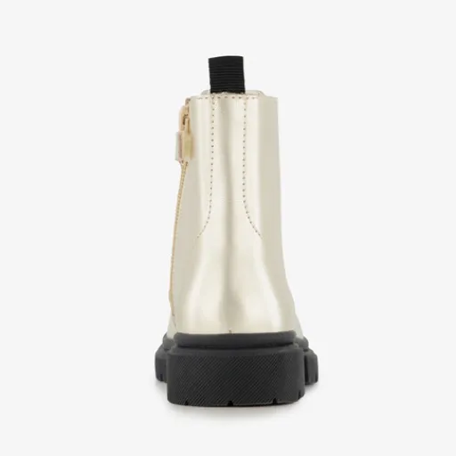 Goudkleurige veterboots voor meisjes van Stap. Het buiten- en binnenwerk zijn van leer gemaakt en de stevige buitenzool met een lage hak is van rubber. Voorzien van een veter- en ritssluiting voor een optimale pasvorm en een aantreklusje aan de achterzijde voor een makkelijke instap. De boots hebben een comfortabele, vaste binnenzool van leer. Schachthoogte is 10 cm. Deze schoenen met het Stap-keurmerk voldoen aan de volgende kwaliteitseisen: ademend leer, een buigzame zool voor een goede voetafwikkeling, een leren voetbed, een perfecte pasvorm en een verstevigde hiel voor stabiliteit en een gezonde loophouding. De schoenen zijn goedgekeurd door orthopedisch chirurg Dr. Visser.