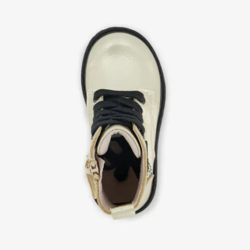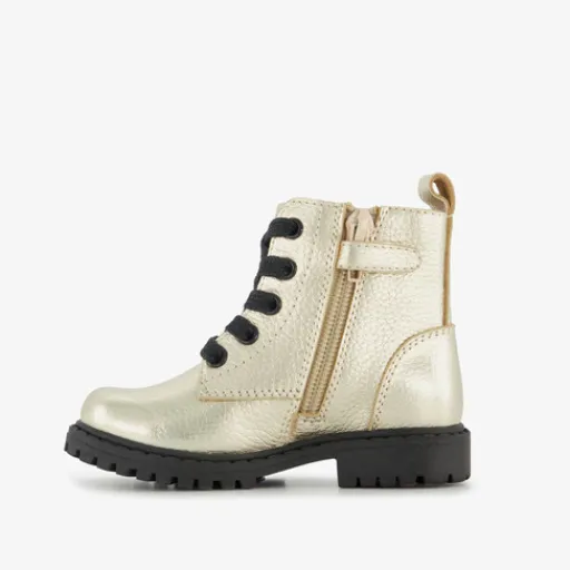 Goudkleurige veterboots met hartjes voor meisjes van Stap. Het buiten- en binnenwerk zijn van leer gemaakt en de stevige buitenzool met een lage hak is van rubber. Voorzien van een veter- en ritssluiting voor een optimale pasvorm en een aantreklusje aan de achterzijde voor een makkelijke instap. De boots hebben een comfortabele, vaste binnenzool van leer. Schachthoogte is 8 cm. Deze schoenen met het Stap-keurmerk voldoen aan de volgende kwaliteitseisen: ademend leer, een buigzame zool voor een goede voetafwikkeling, een leren voetbed, een perfecte pasvorm en een verstevigde hiel voor stabiliteit en een gezonde loophouding. De schoenen zijn goedgekeurd door orthopedisch chirurg Dr. Visser.