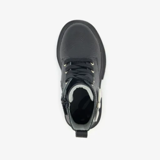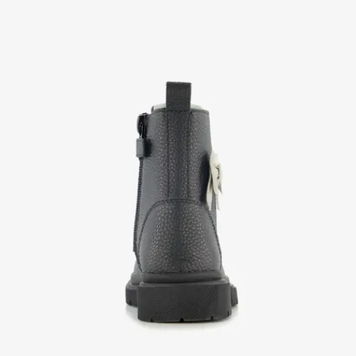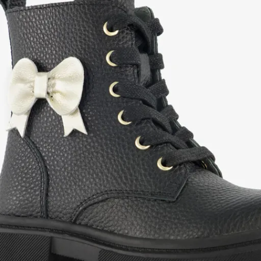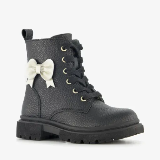 Zwarte veterboots voor meisjes van Stap. Gemaakt van leer, een binnenwerk van leer en een rubberen zool. De boots hebben een rits- en vetersluiting en vast voetbed van leer. Aan de buitenzijde zit een decoratieve strik. Schoenen met het Stap-keurmerk voldoen aan de volgende kwaliteitseisen:-Ademend leer-Buigzame zool voor goede voetafwikkeling-Leren voetbed-Perfecte pasvorm-Verstevigde hiel voor stabiliteit en een gezonde loophoudingDe schoenen zijn goedgekeurd door orthopedisch chirurg Dr. Visser.