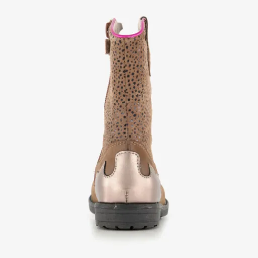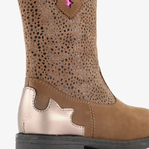 Bruine cowboylaarsjes van Stap. Gemaakt van suède, een binnenwerk van leer en een rubberen zool. De laarsjes hebben een ritssluiting aan de binnenzijde en vast voetbed van leer. Voorzien van stipjes op de schacht en een metallic detail op de hiel. De schachthoogte bedraag 13 cm.Deze schoenen met het Stap-keurmerk voldoen aan de volgende kwaliteitseisen: ademend leer, een buigzame zool voor een goede voetafwikkeling, een leren voetbed, een perfecte pasvorm en een verstevigde hiel voor stabiliteit en een gezonde loophouding. De schoenen zijn goedgekeurd door orthopedisch chirurg Dr. Visser.