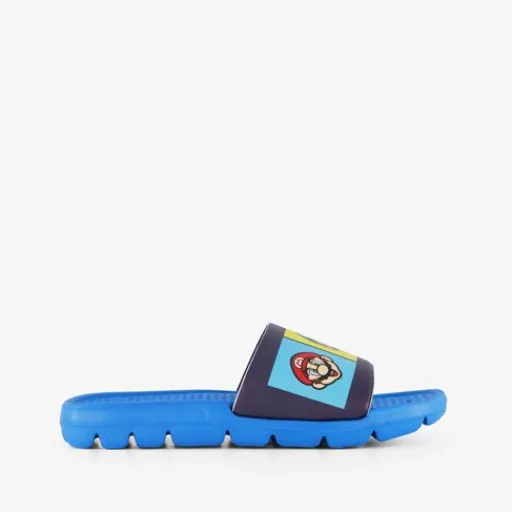 Blauwe Mario badslippers voor kinderen. Voorzien van een brede, comfortabele band over de tenen met opdrukken van Mario, Luigi en Yoshi. Deze gave badslippers zijn gemaakt van imitatieleer en hebben een stevige profielzool.