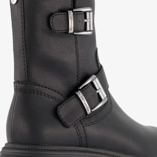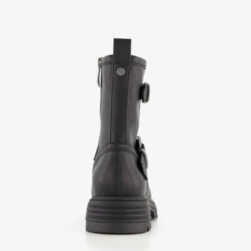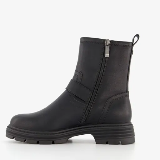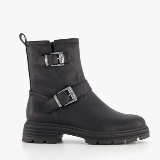 Zwarte biker boots voor dames van Tamaris. Gemaakt van imitatieleer met een binnenwerk van textiel en een stevige profielzool van rubber. Voorzien van hiellusjes, een ritssluiting aan de binnenzijde en twee gespen aan de buitenzijde. Deze stoere boots hebben een comfortabele binnenzool van textiel. Deze is niet uitneembaar. Schachthoogte is 16 cm en hakhoogte is 2 cm.
