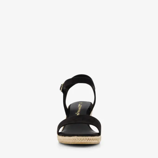 Zwarte espadrilles voor dames van Tamaris. Met een boven- en binnenwerk van imitatieleer en een stevige buitenzool van rubber. De espadrilles hebben een wreefbandje met gespsluiting en bandjes rondom de hiel en tenen. Het zachte voetbed is gemaakt van imitatieleer. De espadrilles hebben een gevlochten sleehak van circa 7,5 cm hoog.