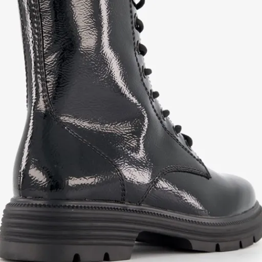 Zwarte lak veterboots voor dames van Tamaris. Gemaakt van imitatieleer met een binnenwerk van textiel en een rubberen profielzool. De boots hebben een vetersluiting, een rits aan de binnenzijde en hiellusjes voor een makkelijke instap. De vaste binnenzool is gemaakt van textiel. De schachthoogte bedraagt 16 cm. De veterboots hebben een lage hak 2 cm.