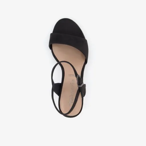 Zwarte sandalen met hak voor dames van Tamaris. Het boven- en binnenwerk zijn gemaakt van textiel en het vaste voetbed is gemaakt van synthetisch materiaal. De sandalen hebben een gespsluiting bij de enkel en een hakhoogte van circa 7 cm.