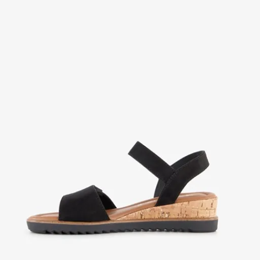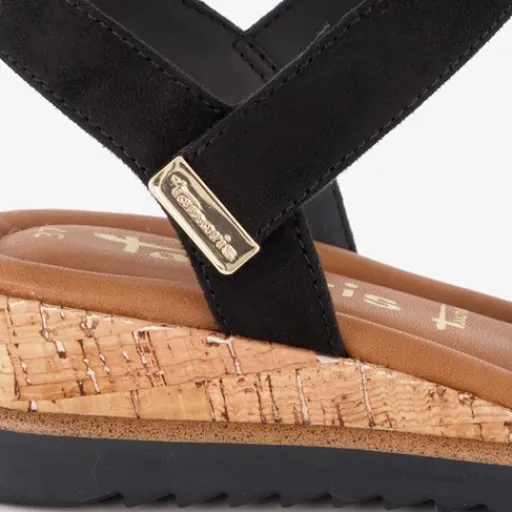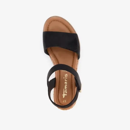 Zwarte sandalen met sleehak voor dames van Tamaris. Het bovenwerk is gemaakt van imitatieleer en de buitenzool met profiel is van rubber. Voorzien van een teenband met klittenbandsluiting en een band bij de enkel met klittenbandsluiting. De sandalen hebben sleehak van circa 5 cm. Binnenzool is niet uitneembaar.