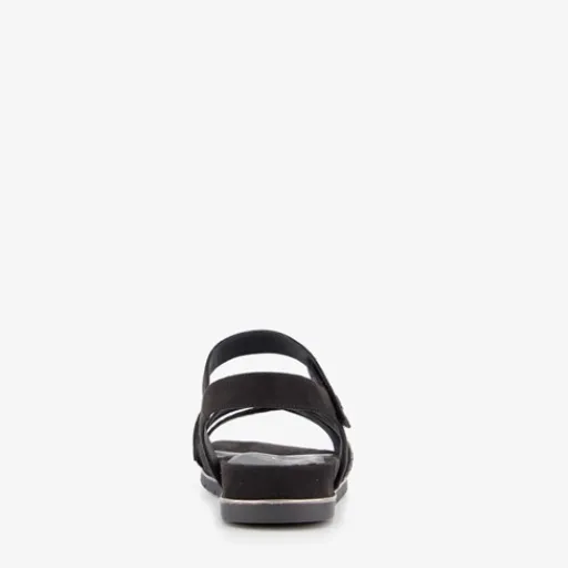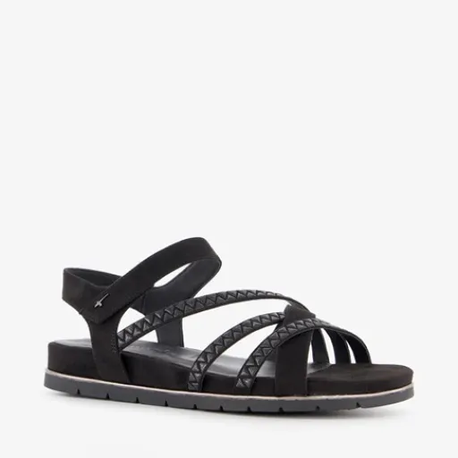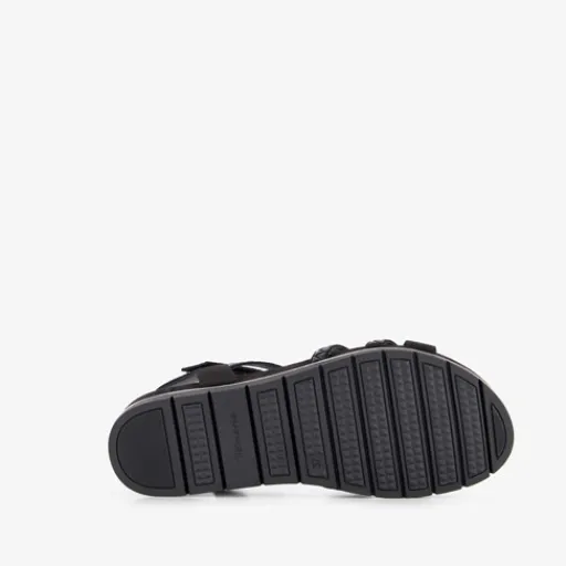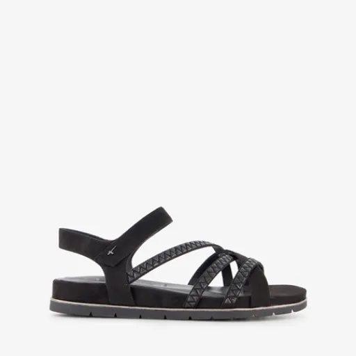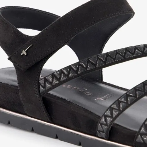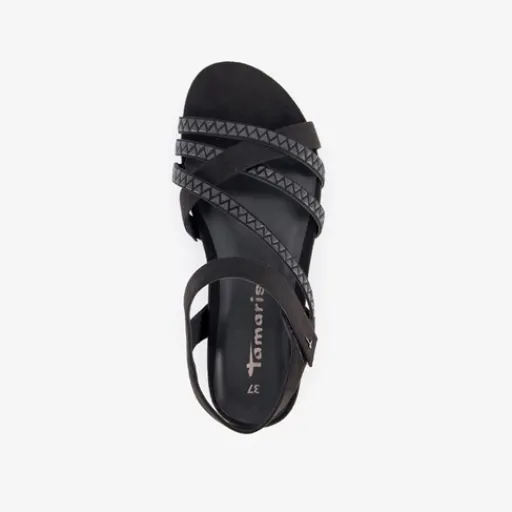 Zwarte sandalen voor dames uit de Tamaris collectie. Het boven- en binnenwerk zijn van imitatieleer en de buitenzool met profiel is van rubber. Voorzien van cross-over bandjes over de wreef en een klittenbandsluiting bij de enkel. Binnenzool is niet uitneembaar. Op de buitenzool is een goudkleurige detail aangebracht.