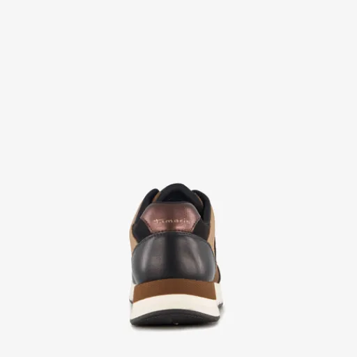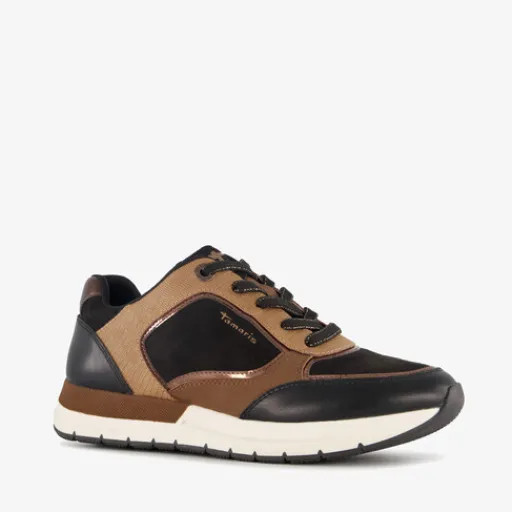 Bruin-zwarte sneakers van Tamaris voor dames. Het buitenwerk is gemaakt van textiel en imitatieleer, het binnenwerk van textiel en de stevige buitenzool met profiel is van rubber. Voorzien van een vetersluiting en een uitneembare binnenzool van synthetisch materiaal. De sneakers hebben goudkleurige accenten en merkopdrukken op het bovenwerk en een wit-zwarte buitenzool.