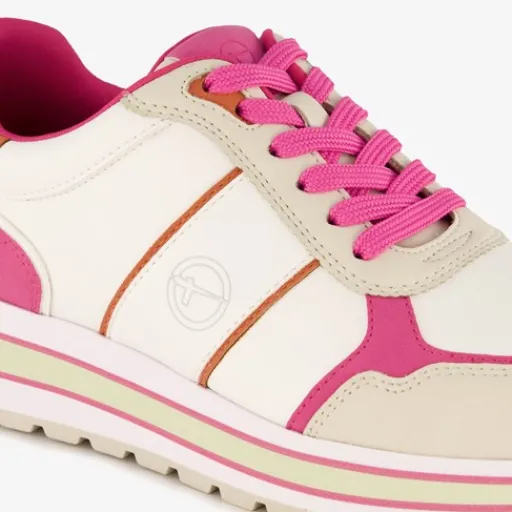 Witte Tamaris dames sneakers met roze details. Gemaakt van imitatieleer, een binnenwerk van textiel en een rubberen zool. De sneakers hebben een vetersluiting en comfortabel soft foam voetbed. Deze is uitneembaar.