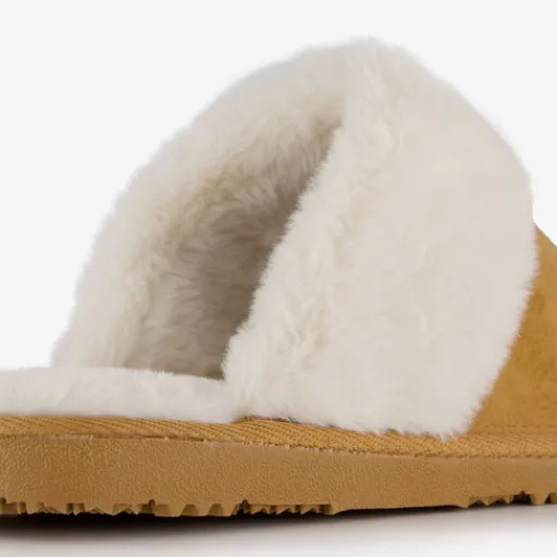 Bruine pantoffels met een voering van imitatiebont voor dames uit de Thu!s collectie. Het buiten- en binnenwerk zijn gemaakt van textiel en de stevige zool met profiel is van rubber. De sloffen hebben een zachte voering die je voeten comfortabel en warm houden.