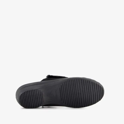 Zwarte pantoffels met imitatiebont voor dames. Het binnen- en buitenwerk zijn gemaakt van textiel en de stevige profielzool van rubber. De pantoffels hebben een klein hakje en een vast voetbed van textiel.