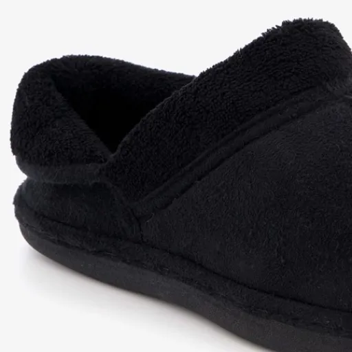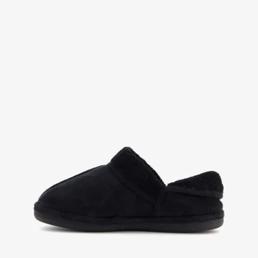 Zwarte, gevoerde pantoffels voor dames van Thu!s. Gemaakt van textiel, een binnenwerk van textiel en een stevige profielzool. De pantoffels hebben een zachte, warme voering en een comfortabel voetbed.