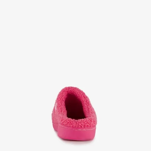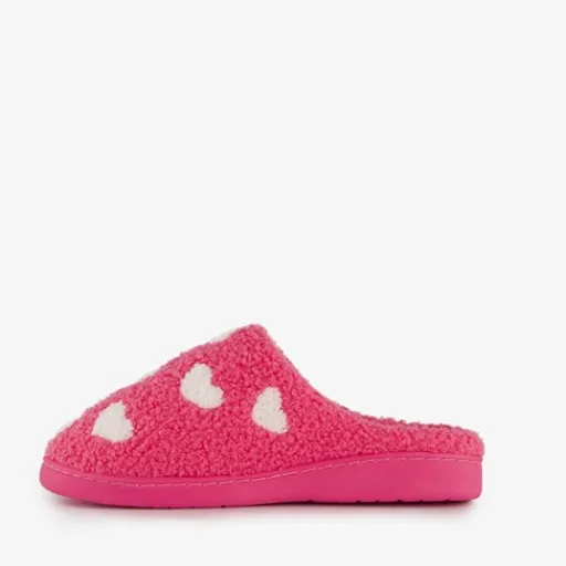 Roze teddy sloffen met witte hartjes voor dames van Thuis. Gemaakt van textiel met een profielzool van rubber. De sloffen hebben een zachte, warme voering.