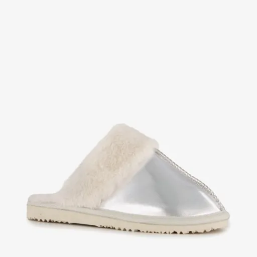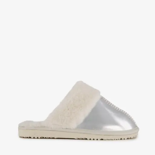 Zilverkleurige pantoffels met een witte voering van imitatiebont voor dames uit de Thu!s collectie. Het buiten- en binnenwerk zijn gemaakt van textiel en de stevige zool met profiel is van rubber. De sloffen hebben een zachte voering die je voeten comfortabel en warm houden.