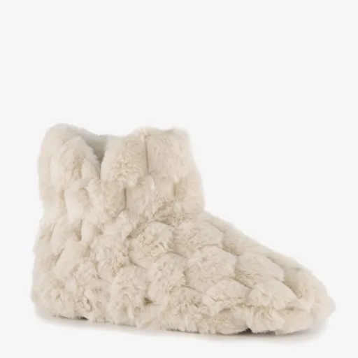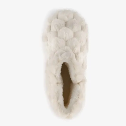 Fluffy, beige dames pantoffels. Gemaakt van imitatiebont met een stevige zool van. De fluffy pantoffels hebben een warme, zachte voering en voetbed van textiel.