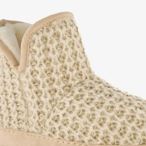Beige, gebreide pantoffels voor dames. Gemaakt van textiel, een binnenwerk van textiel en een stevige profielzool van rubber. De pantoffels hebben een zachte, warme voering van imitatiebont en subtiele, gouden details op het bovenwerk.