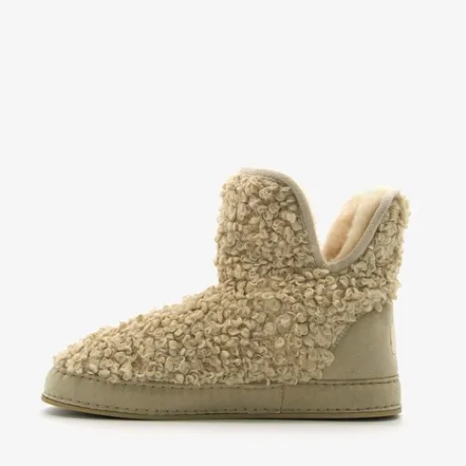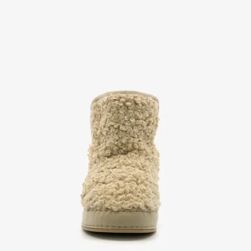 Hoge, beige sloffen voor dames. De sloffen hebben een elastische instap met een zachte voering van imitatiebont. Op het bovenwerk is teddystof aangebracht. De warme sloffen hebben een stevige zool.