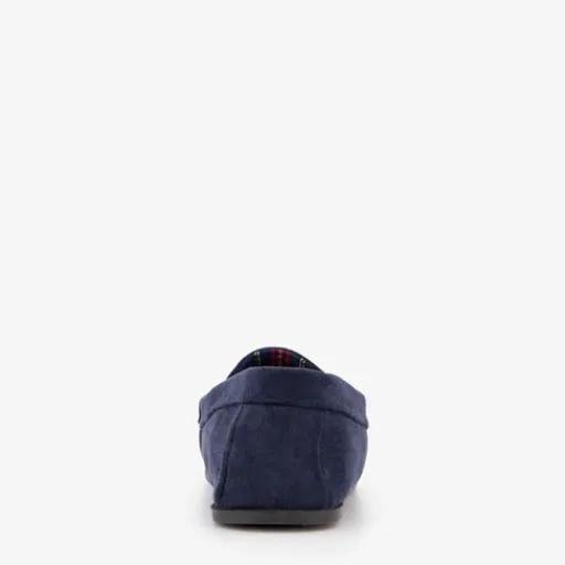 Blauwe mocassin pantoffels voor heren. Gemaakt van imitatiesuede, een binnenwerk van textiel en een rubberen zool. De mocassin pantoffels hebben een elastische instap, vast voetbed van textiel en ruitprint aan de binnenzijde.