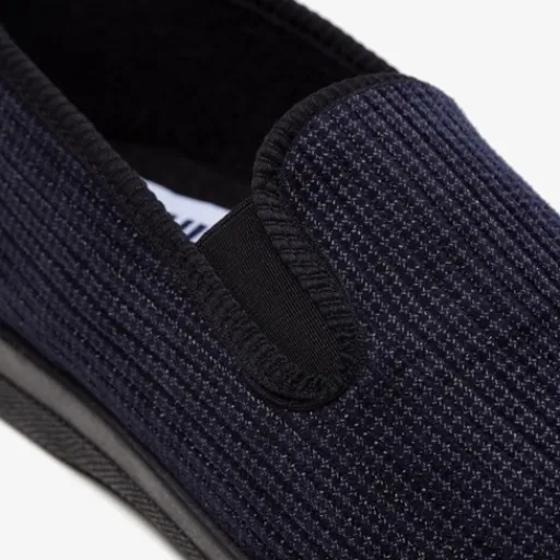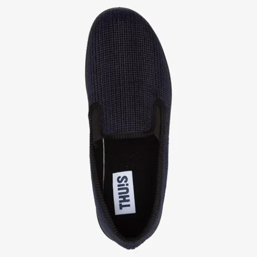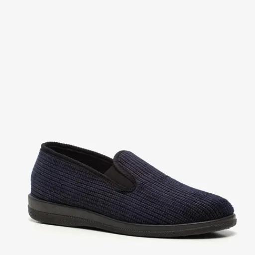 Donkerblauwe pantoffels voor heren. Gemaakt van textiel, een binnenwerk van textiel en een stevige zool van rubber. De pantoffels hebben elastische inzetjes voor een makkelijke instap. Het comfortabele, zachte voetbed is gemaakt van textiel.