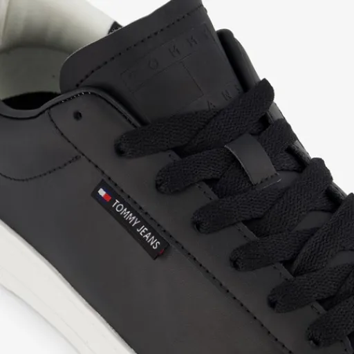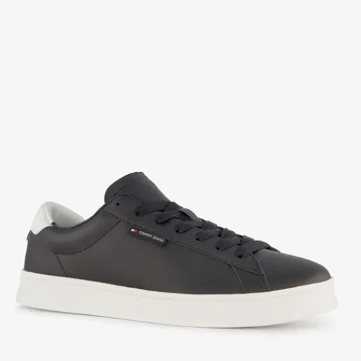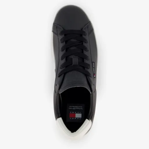 Zwarte Tommy Hilfiger sneakers voor heren. Het buitenwerk is gemaakt van leer, het binnenwerk van textiel en de profielzool van rubber. Voorzien van een vetersluiting en een uitneembare binnenzool van synthetisch materiaal. De sneakers hebben 2 perforatiegaten aan de binnenzijde, een witte inzet op de hak en een contrasterende, witte buitenzool.