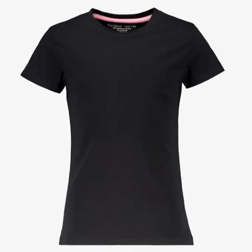 Zwart basic T-shirt voor meisjes van TwoDay. Voorzien van een ronde hals en korte mouwen. Dit artikel is gemaakt met 95% biologisch katoen en 5% elastaan.