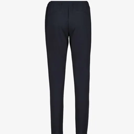 Blauwe, comfortabele pantalonbroek voor dames. Voorzien van een elastische tailleband, twee steekzakken en een slimfit pasvorm. De broek heeft witte strepen aan de zijkanten. Gemaakt van 95% polyester en 5% elastaan.ΒΆ