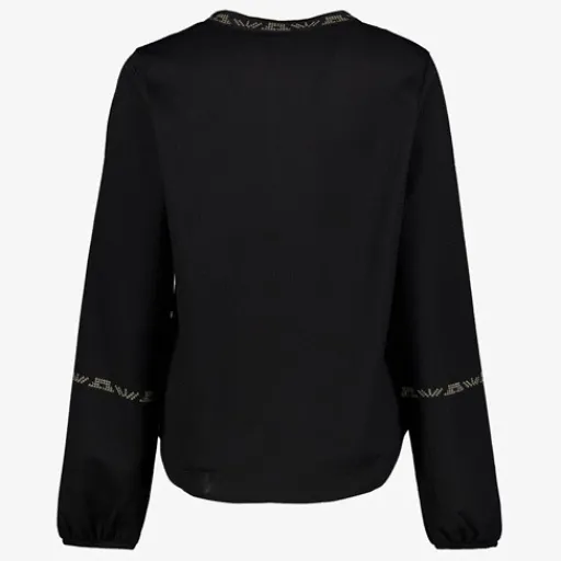 Zwarte blouse voor dames. Voorzien van lange mouwen met elastiek en een V-hals met strikkoordjes. De blouse heeft beige, geborduurde details en is gemaakt van 97% polyester en 3% elastaan.