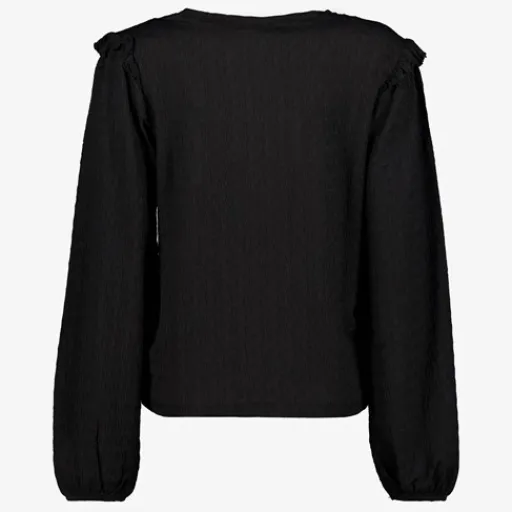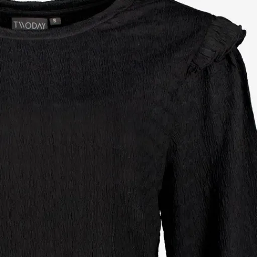 Zwarte blouse voor dames. Voorzien van lange mouwen, een rond hals en subtiele ruches op de schouders. Gemaakt van 97% polyester en 3% elastaan.