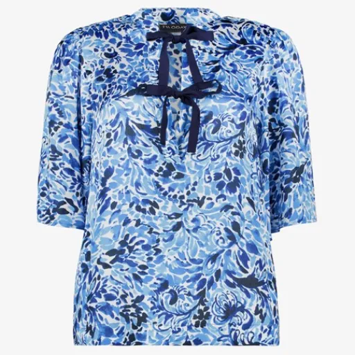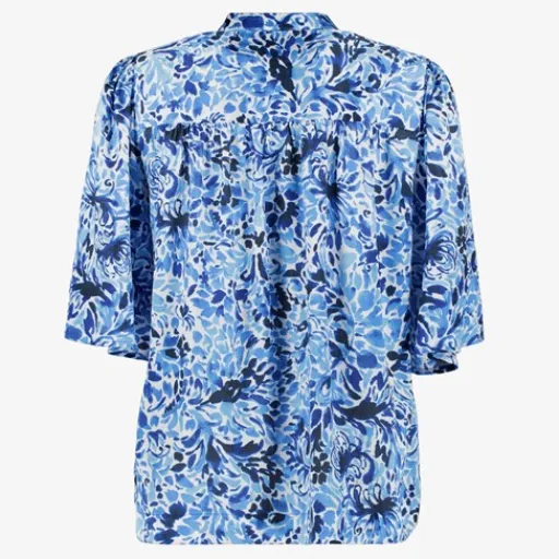 Blauwe blouse met een all over print voor dames van TwoDay. Voorzien van een V-hals met twee zwarte strikjes en halflange mouwen. Gemaakt van 97% polyester en 3% elastaan.