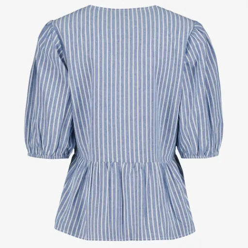 Gestreepte blouse voor dames met strikjes. Voorzien van halflange mouwtjes met elastiek, een ronde hals en strikkoordjes aan de voorzijde. Gemaakt van 100% katoen.