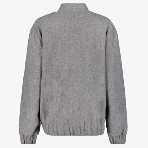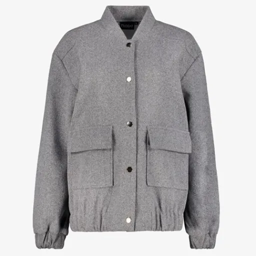 Grijs bomerjack voor dames. Voorzien van knoopsluitingen, twee klepzakken en elastische boorden. De bomer jas is gemaakt van 95% polyester en 5% elastaan.