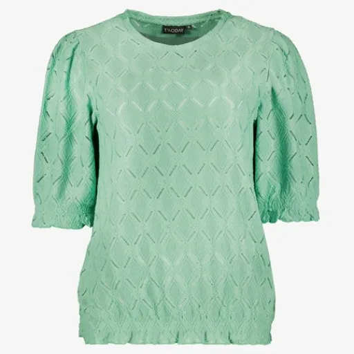 Mintgroen shirt voor dames. Voorzien van een ronde hals en halflange mouwtjes met ruches. Het shirt heeft perforaties in de stof en is gemaakt van 98% polyester en 2% elastaan.